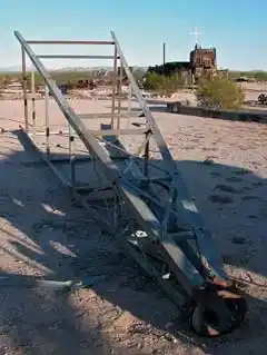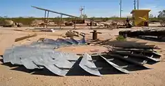 Having been previously disassembled, the windmill was found to be in many parts and was transported to Goffs by John Terrill and Dennis Casebier. Restoration and reassembly of the windmill was started during the 2012 Spring Encampment by Sharon Holmes and Don Walter. Major task included figuring out how to assemble all the pieces and parts and how to straighten out some bent components. The windmill pieces were moved from the south end of the Goffs property to an area near the Library Depot, where the windmill would find a permanent home.
