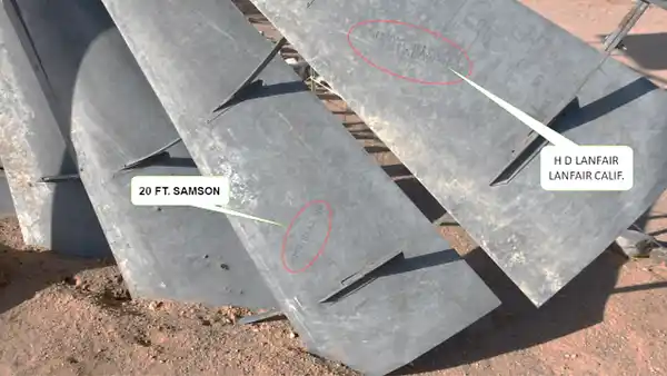 Here, the windmill manufacturer and component ID, “20 Ft. Samson”, can be seen, along with the person that received the mill, “HD Lanfair, Lanfair, CA."